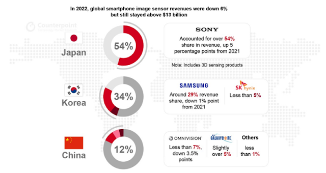 現在グローバルCIS市場は日本のソニーと韓国のサムスンがリードしています。グローバル市場調査企業の「カウンターポイント」が発表したCIS市場占有率統計を見てみるとソニーが54%で独走している中、サムスンとSKがその後を追撃している様子を見せています。